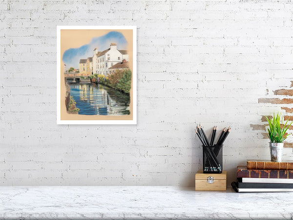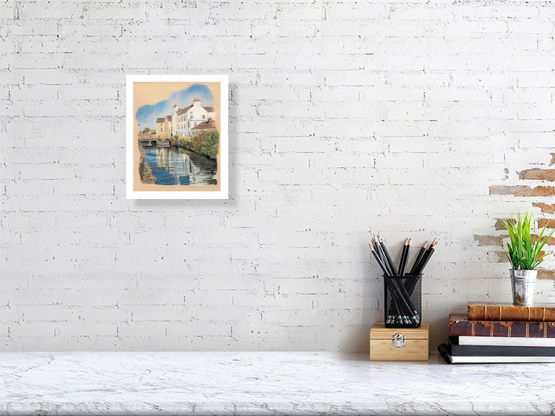 Bright and cheerful glance up the canal by Dominick St, with An Tobar Nua visible in the background.printed on Giclée Canson Aquarelle Rag